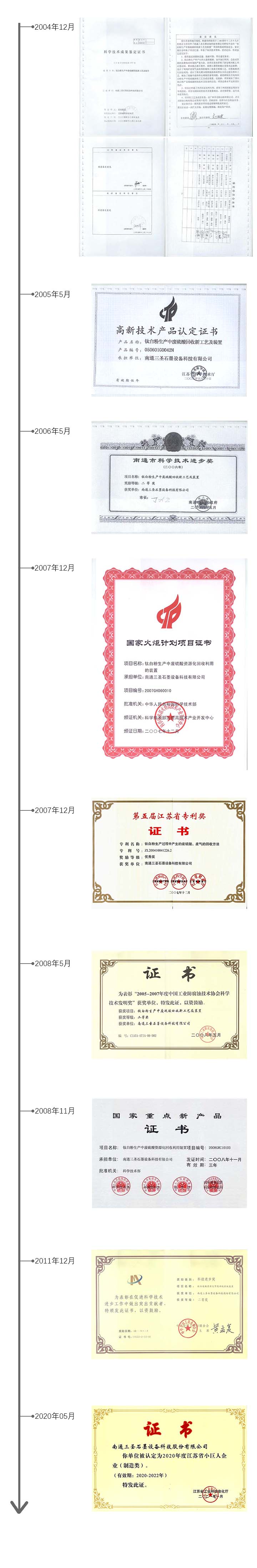 南通三圣該項技術先后得到了政府諸多部門的高度評價。2004年12月,“鈦白粉生產中廢硫酸回收新工藝及裝置”通過江蘇省科技廳組織的科技成果鑒定,鑒定意見指出,該項成果填補了國內鈦白粉產業廢硫酸回收技術及裝備的空白,總體水平達到國際先進。2005年5月,該項成果被認定為江蘇省高新技術產品。2006年5月,該項成果榮獲南通市科技進步二等獎。2007年12月,“鈦白粉生產中廢硫酸資源化回收利用的裝置”被科技部列為國家火炬計劃項目。2007年12月,“鈦白粉生產過程中產生的廢硫酸、廢氣的回收方法”榮獲江蘇省優秀專利獎。2008年5月,“鈦白粉生產中廢硫酸回收新工藝及裝置”榮獲中國工業防腐蝕技術協會技術發明二等獎。2008年11月,“鈦白粉生產中廢硫酸資源化回收利用裝置”被科技部、環保部、商務部、國家質檢總局認定為國家重點新產品。2011年12月,“鈦白廢酸資源化節能回收系統裝置”榮獲中華全國工商業聯合會科技進步二等獎。2020年,公司以工業廢副硫酸低能耗蒸發濃縮與資源化回收成套裝備產品獲得江蘇省專精特新小巨人企業榮譽稱號。