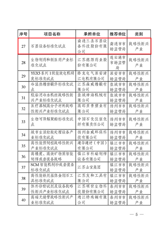 南通三圣標準化工作再傳捷報,公司申報的“石墨設備標準化試點”項目獲得江蘇省市場監督管理局、江蘇省發展和改革委員會正式立項,成為2022年江蘇省戰略性新興產業標準化試點41個項目之一,也是南通市獲此立項的兩個項目之一 。
