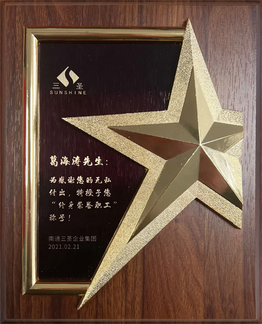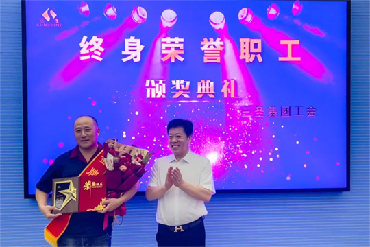 三圣奮斗史中閃耀著這樣一顆璀璨之星,他以堅定的信念和不懈的努力,登上榮譽巔峰,成為開發區當之無愧的一名“金牌員工”,并被三圣集團董事會、三圣工會授予“終身榮譽職工”的光榮稱號。