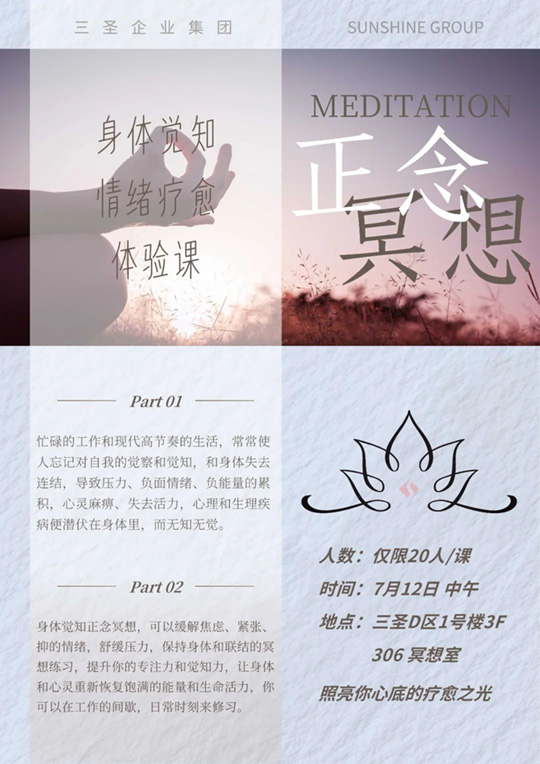 三圣集團最新開設的冥想課程,旨在幫助職工通過冥想達到內心的寧靜與平和,提升個人的情緒管理、專注力和生活質量。隨著今天第一堂體驗課的啟動,之后每周都有免費的公益課程可報名參加。這一全新形式的開放課程,升華了三圣企業文化的精神內涵。