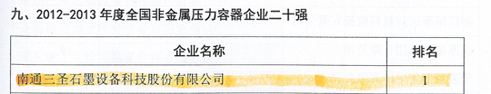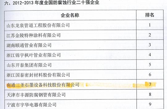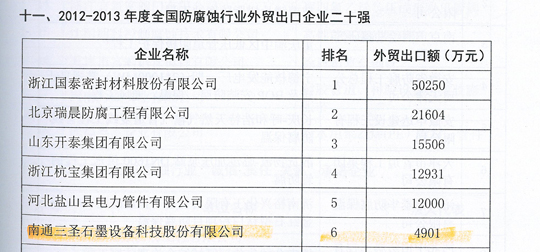 在剛剛閉幕的第五屆中國國際腐蝕控制大會上,南通三圣石墨設備科技股份有限公司憑借其優異的業績榮登三大榜單,分別是:"2012-2013年度全國防腐蝕行業二十強企業"(排名第7位);"2012-2013年度全國非金屬壓力容器企業二十強"(排名第1位);"2012-2013年度全國防腐蝕行業外貿出口企業二十強"(排名第6位)。