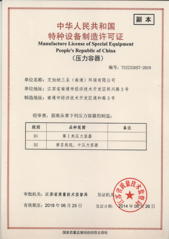 日前,艾伯納三圣(南通)環(huán)保有限公司順利取得了由江蘇省質(zhì)量技術(shù)監(jiān)督局頒發(fā)的《中華人民共和國特種設(shè)備制造許可證》。獲準從事D1(第Ⅰ類壓力容器)、D2(第Ⅱ類低、中壓力容器)的制造,標志著艾伯納三圣壓力容器生產(chǎn)的正式開始。